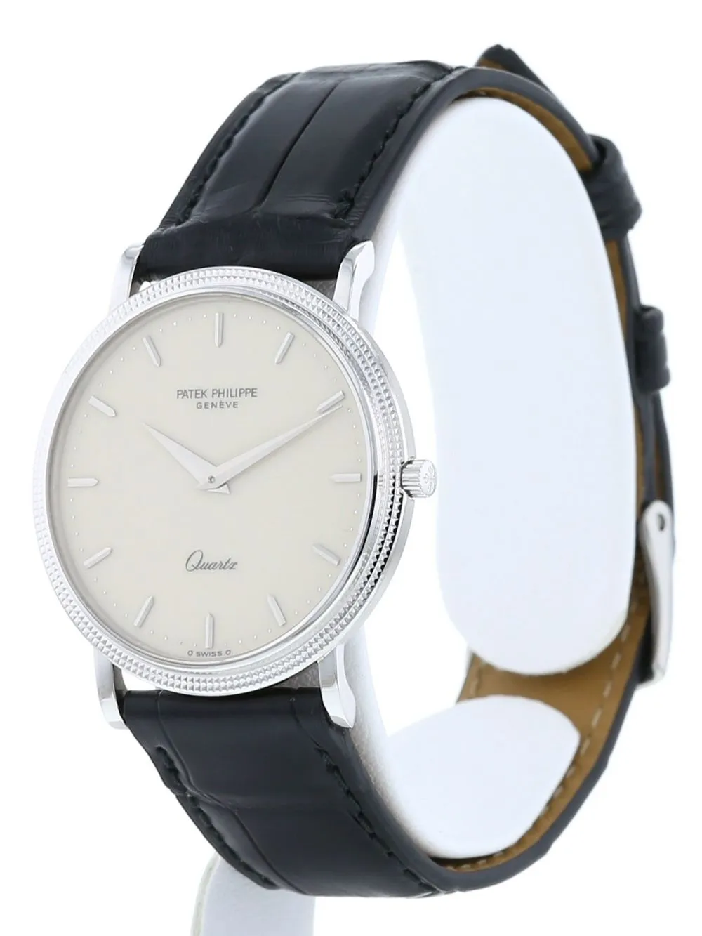 Pure lines and classic details define Patek Philippe's Calatrava collection, one of the Swiss brand's most emblematic creations. Widely recognised for its sleek round case, this 1990 pre-owned Calatrava 33mm is a prime example of the model's timeless appeal, arriving with a minimalistic baton dial and white gold construction.
