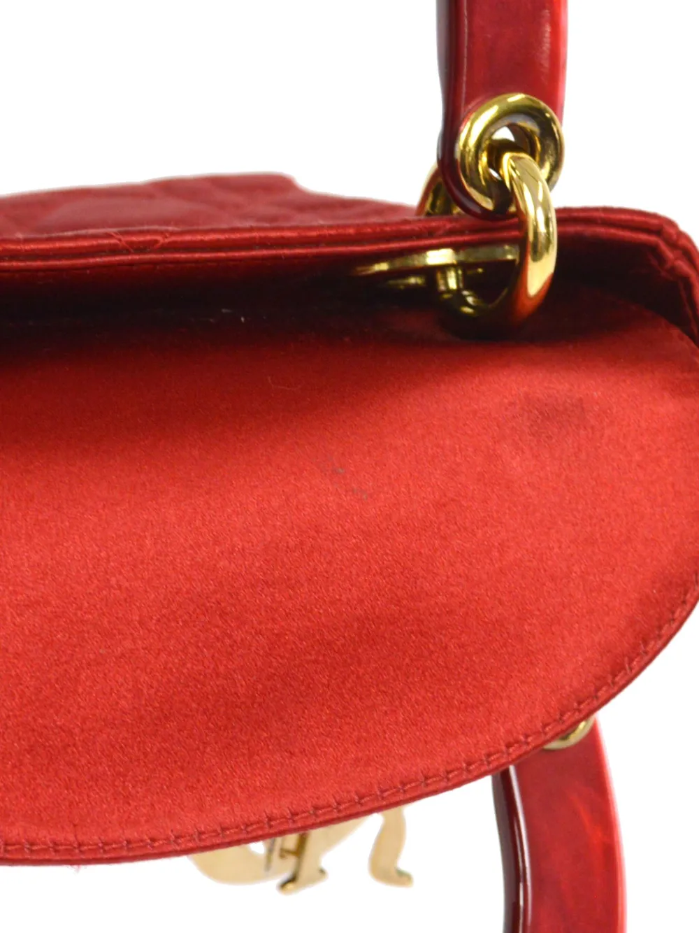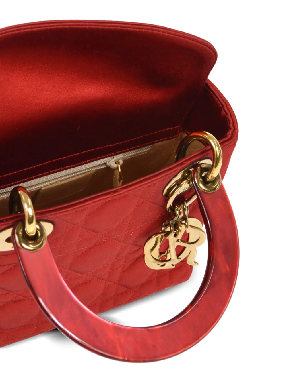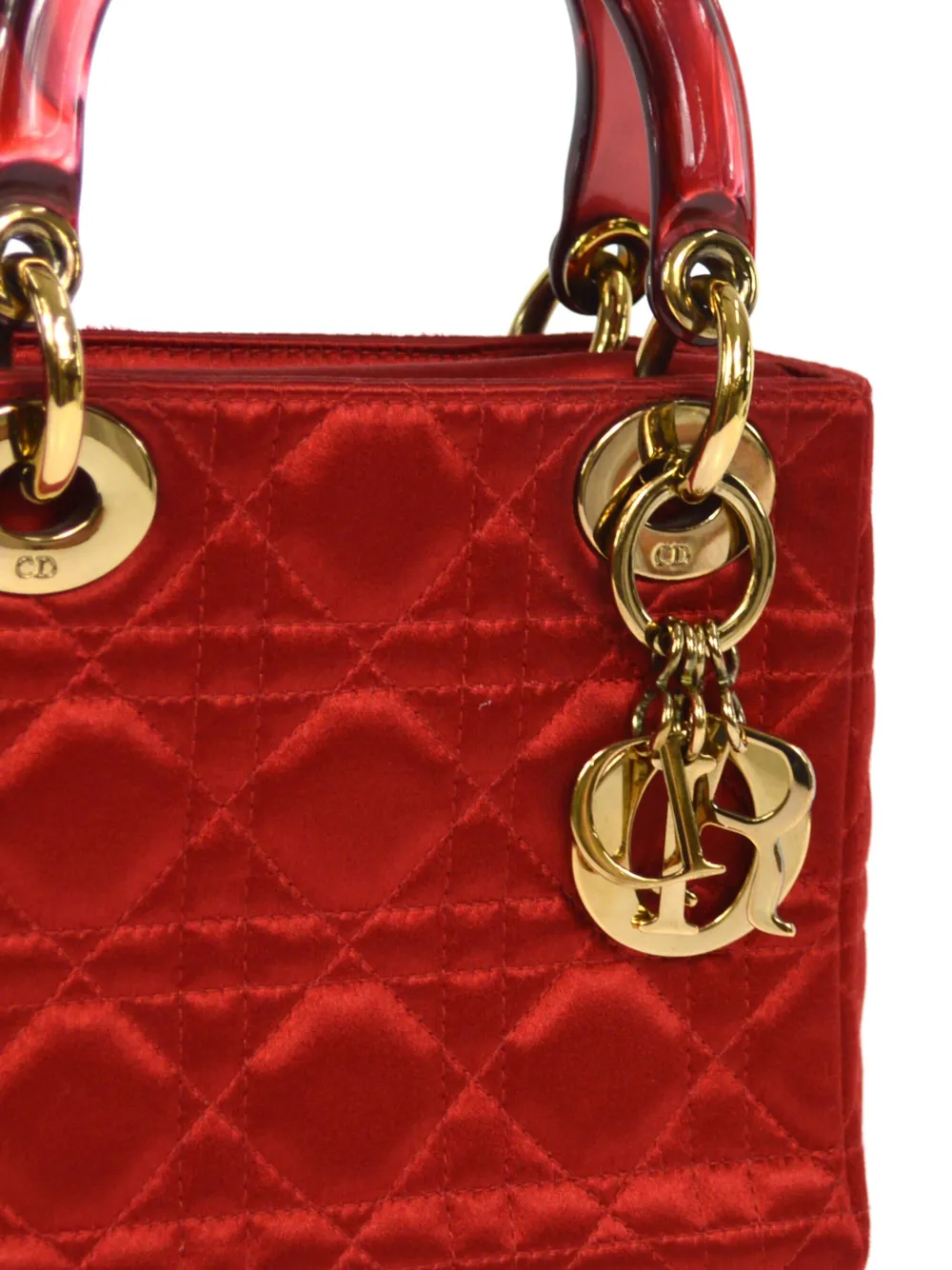 Designed by Christian Dior's then-creative director Gianfranco Ferre in 1994, the Lady Dior was originally coined the Chouchou bag, meaning 'favourite' in French. The design was released to an exclusive clientele including Princess Diana who made the style famous on outings including the 1996 Met Gala, after which it was aptly re-titled the in her honour. Defined by its boxy silhouette and signature gold-tone Dior logo charms, this red satin iteration features the iconic Cannage quilt pattern inspired by Napoléon II’s namesake chairs.