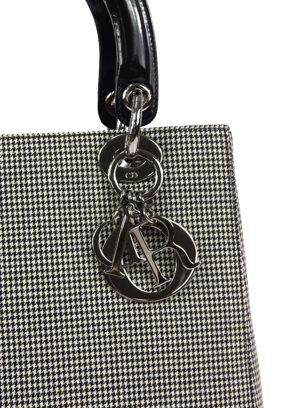 Made popular by Princess Diana and later named after her, Christian Dior's Lady Dior is one of the maison's most iconic styles. Crafted from canvas and patent leather in black and white tones, this version is decorated with a houndstooth pattern and finished with the signature Dior letters charm in polished silver-tone hardware.