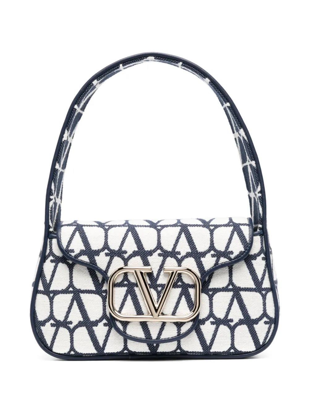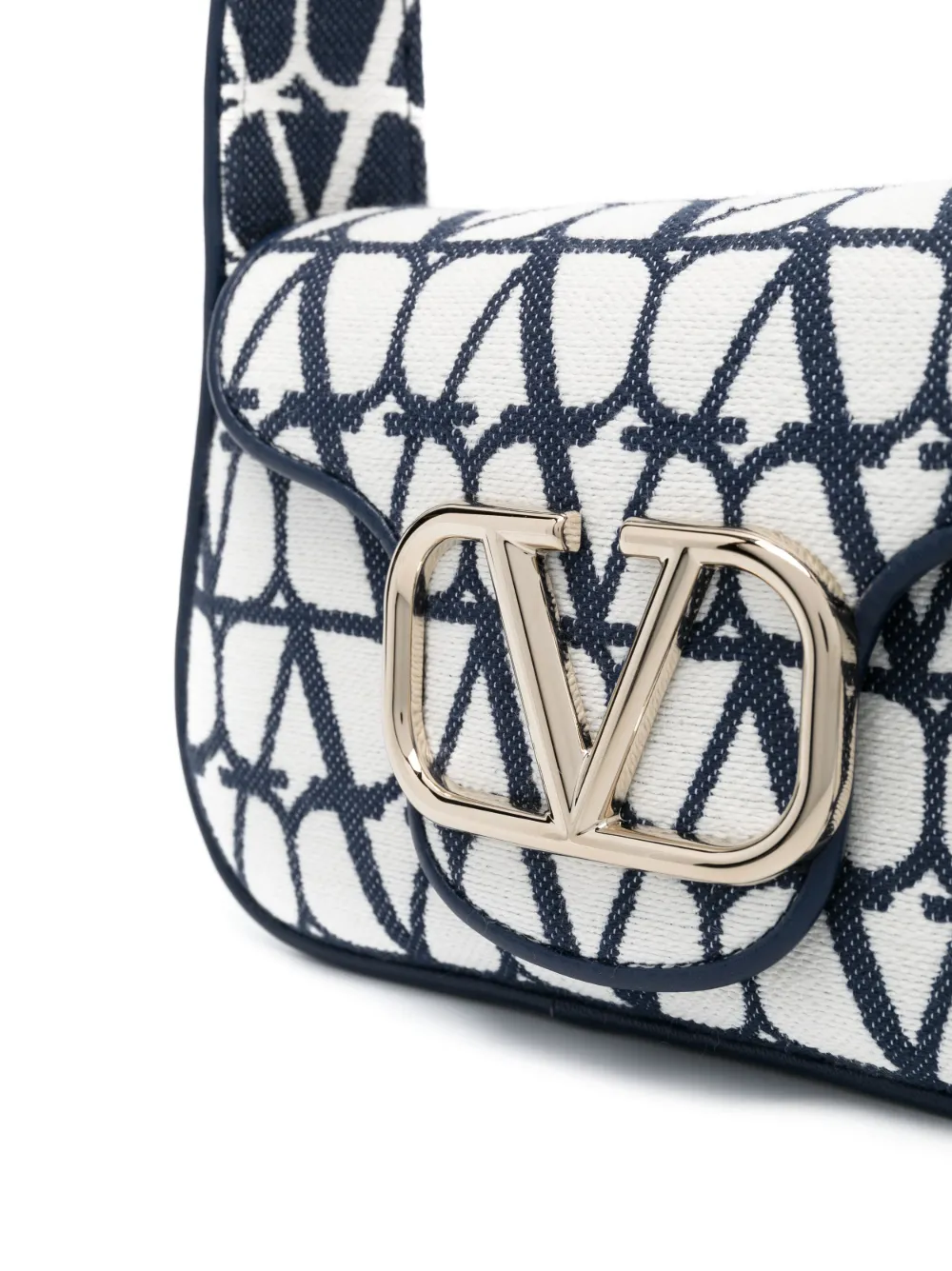 Valentino Garavani's VLogo Signature was introduced in 1968 and has since become an iconic hallmark. The motif is reimagined in the navy-blue Toile Iconographe pattern that adorns this canvas shoulder bag.