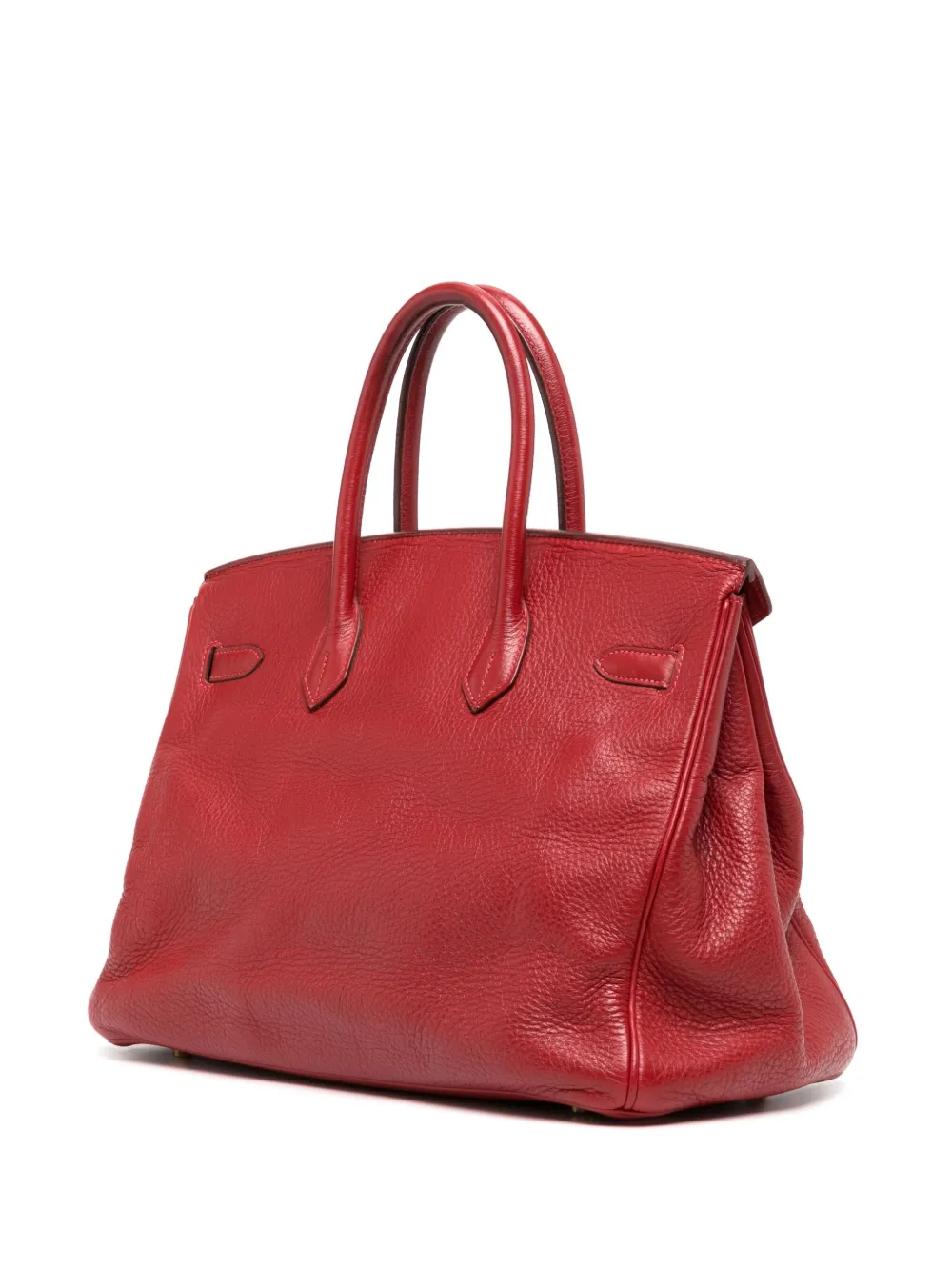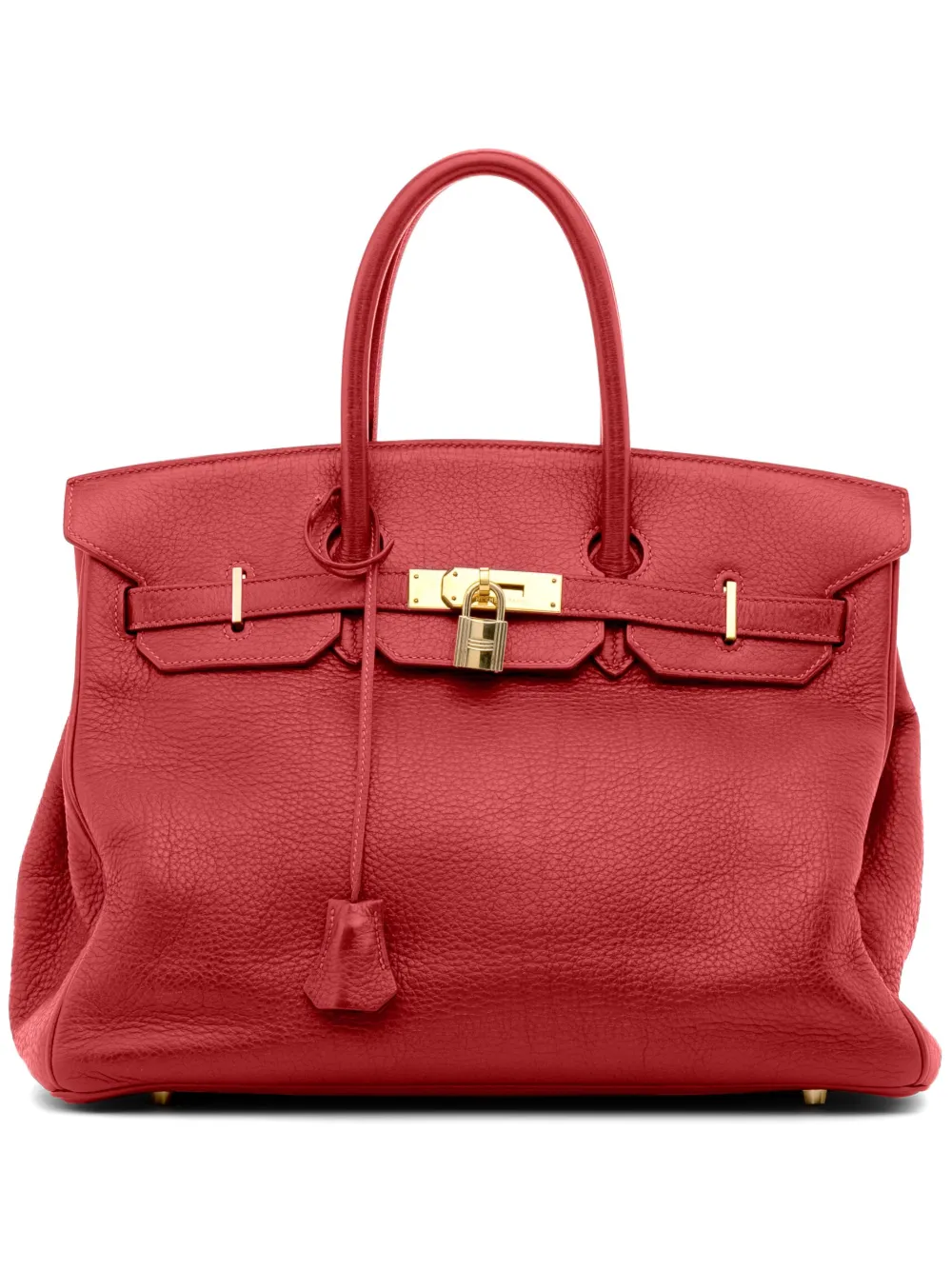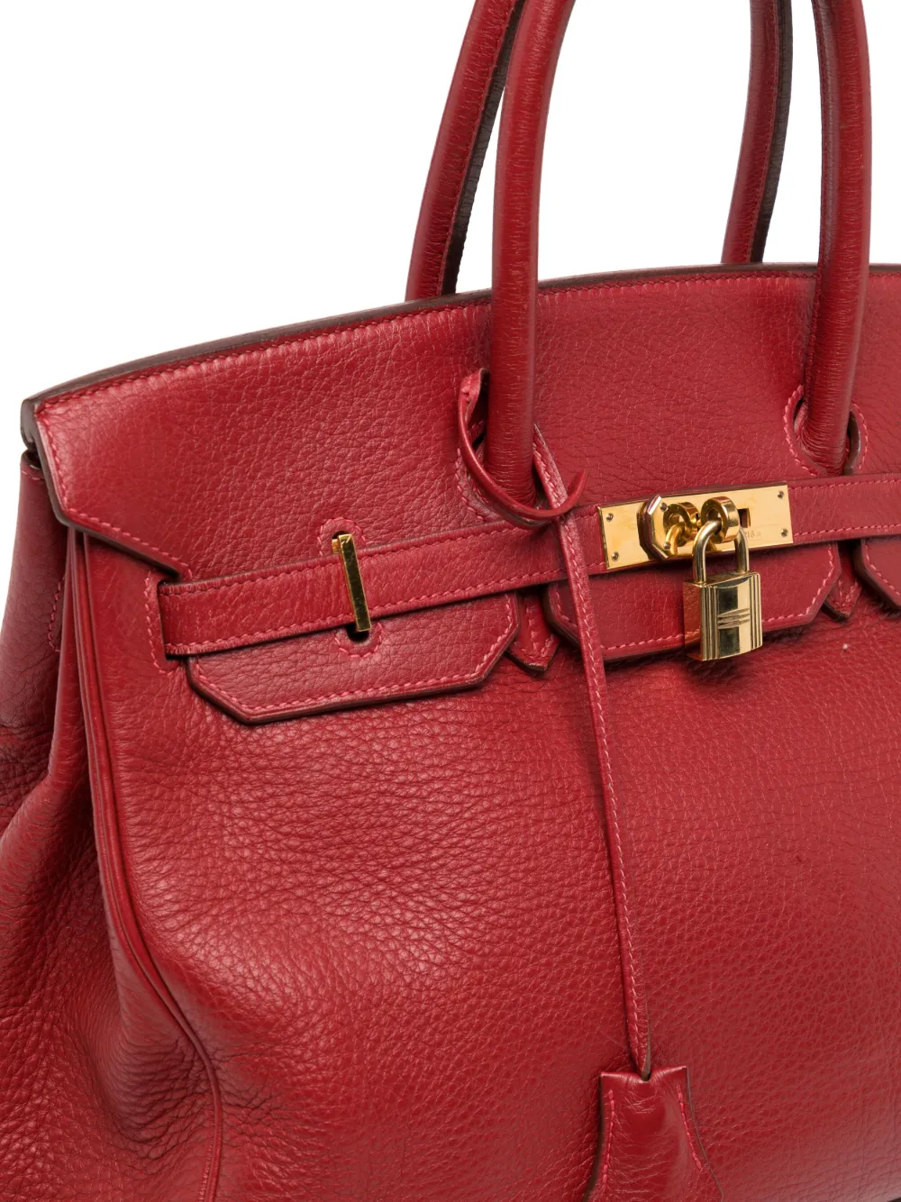 Designed by Hermès’ artistic director Jean-Louis Dumas in 1983 with actress Jane Birkin in mind, the Birkin bag is now considered the epitome of handbags. Constructed with a spacious trapeze-shaped body and delicate metal feet for added structure, this 2002 Birkin 35 version is crafted from Taurillon Clemence leather in a wine red tone.