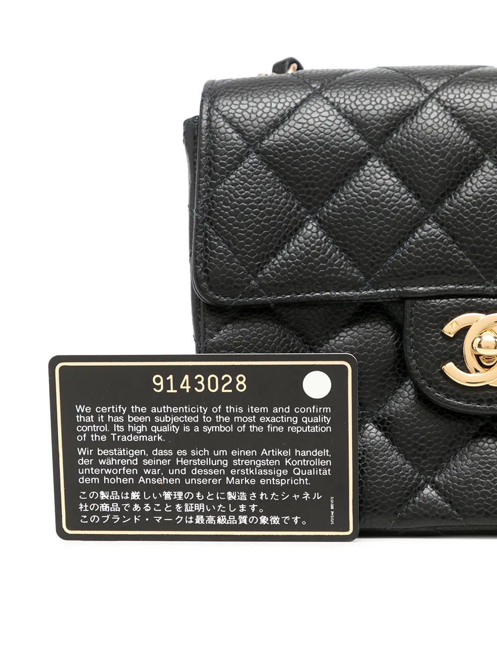 In a black hue and a diamond-quilted caviar leather construction, this mini Classic Flap Square shoulder bag from Chanel is a practical choice that exudes the brand's elegance. Note the signature interlocking CC turn-lock fastening in gold-tone hardware.