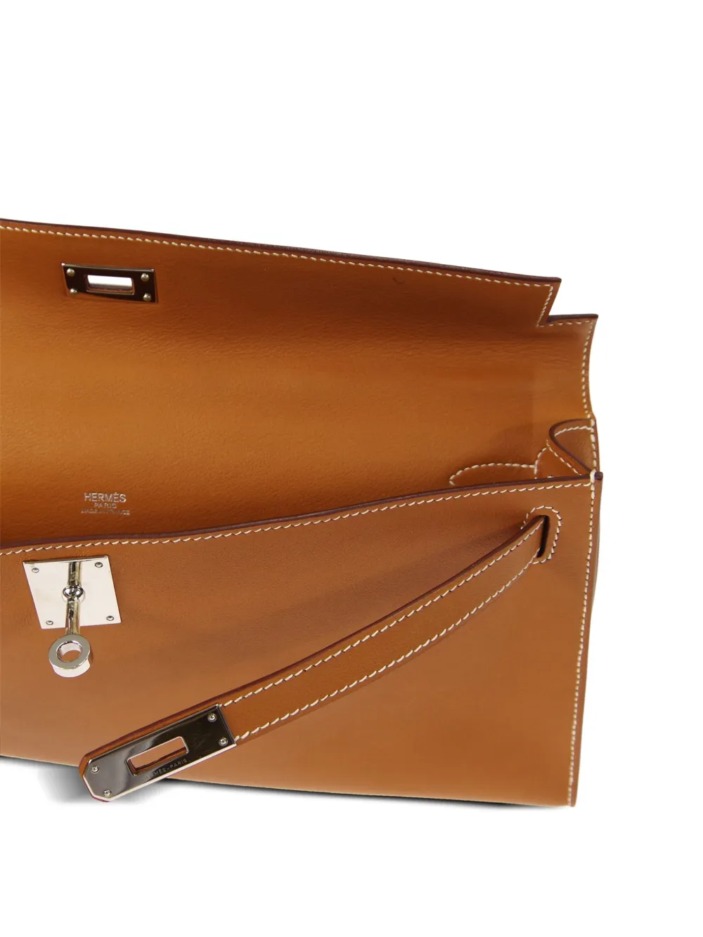 Reimagining the iconic Kelly bag, Hermès presents the classic style in a clutch version. Crafted from golden brown Swift leather, this Kelly Pochette clutch bag showcases the signature strap and twist-lock fastening in polished palladium-tone hardware.