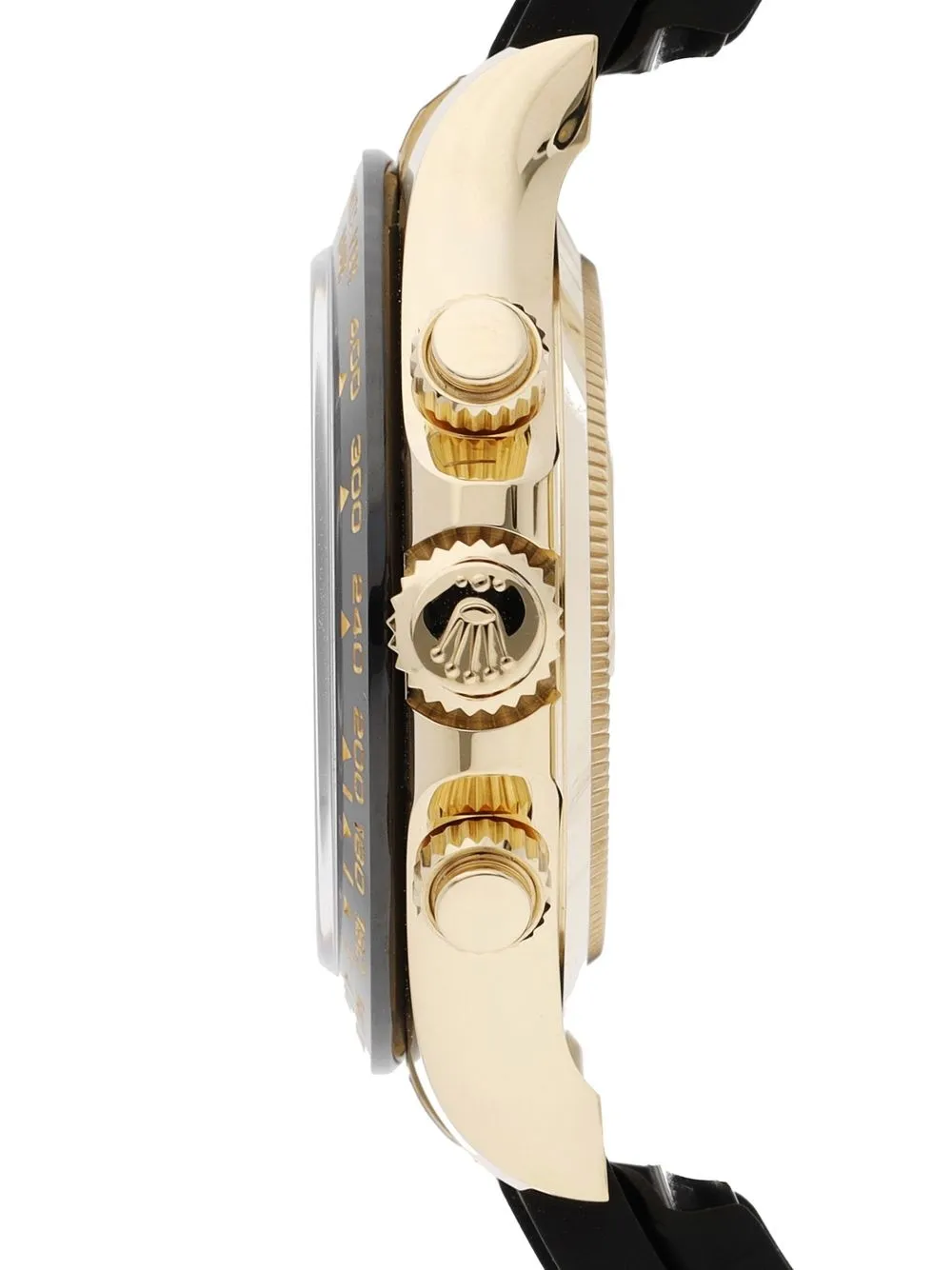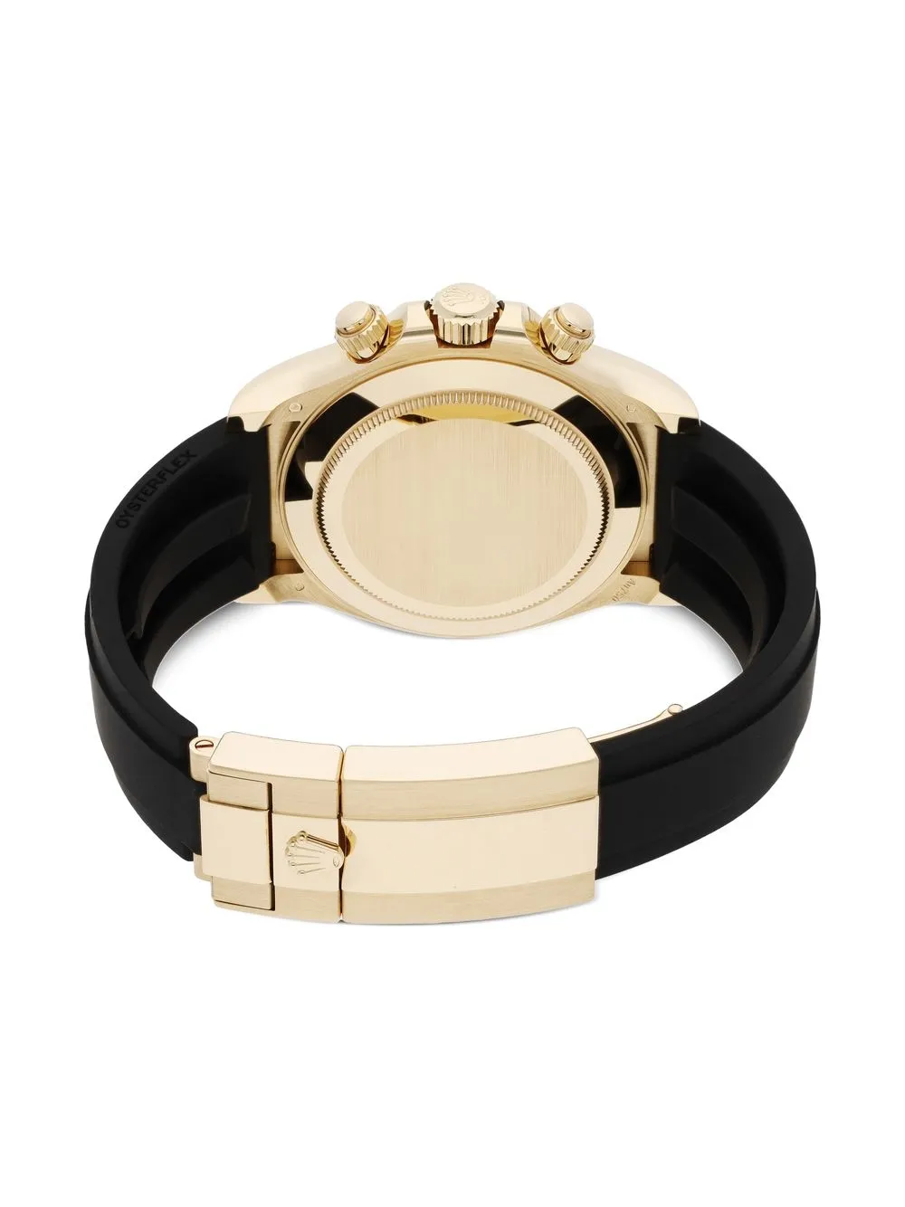2021 unworn Cosmograph Daytona 40mm from Rolex Pre-Owned featuring white, yellow gold, round face, automatic movement, rubber strap, clasp fastening, fixed tachymeter bezel, index dial, baton hands, three chronograph sub-dials, screw-down crown and two chronograph pushers. This piece is new and unworn.. Original box, papers and CHRONEXT certificate included.. An inspection by the CHRONEXT-certified watchmakers guarantees authenticity.. All repairs of the movement of the watch and the repairs of water-resistant watches with water damage are covered by the CHRONEXT two-year warranty..