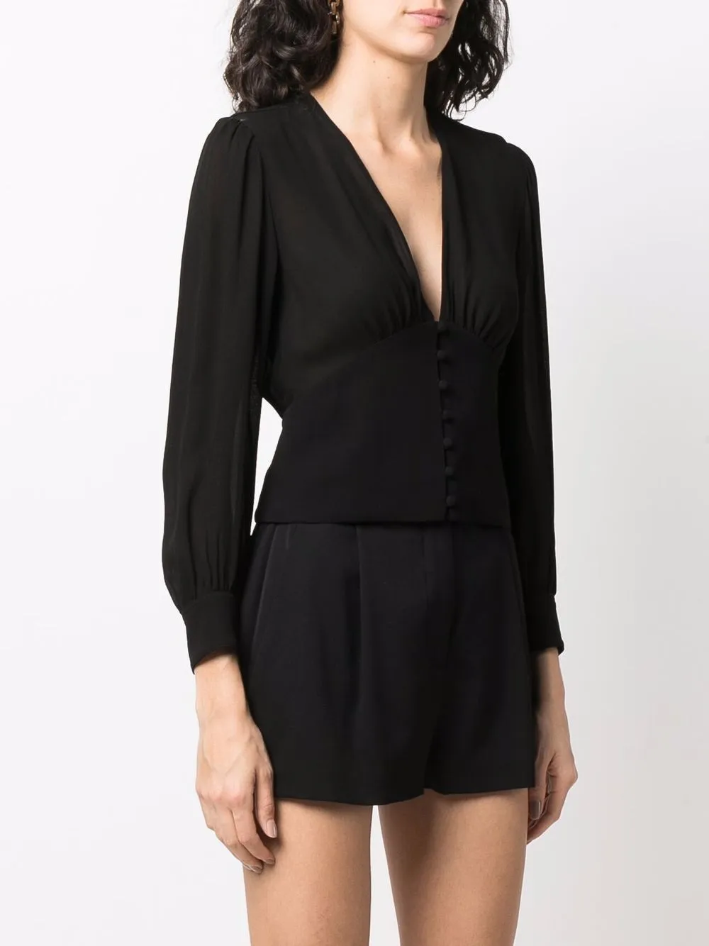Black buttoned-up V-neck blouse from SAINT LAURENT featuring gathered detailing, front button fastening, plunging V-neck, long sleeves and fitted-cuff sleeves.