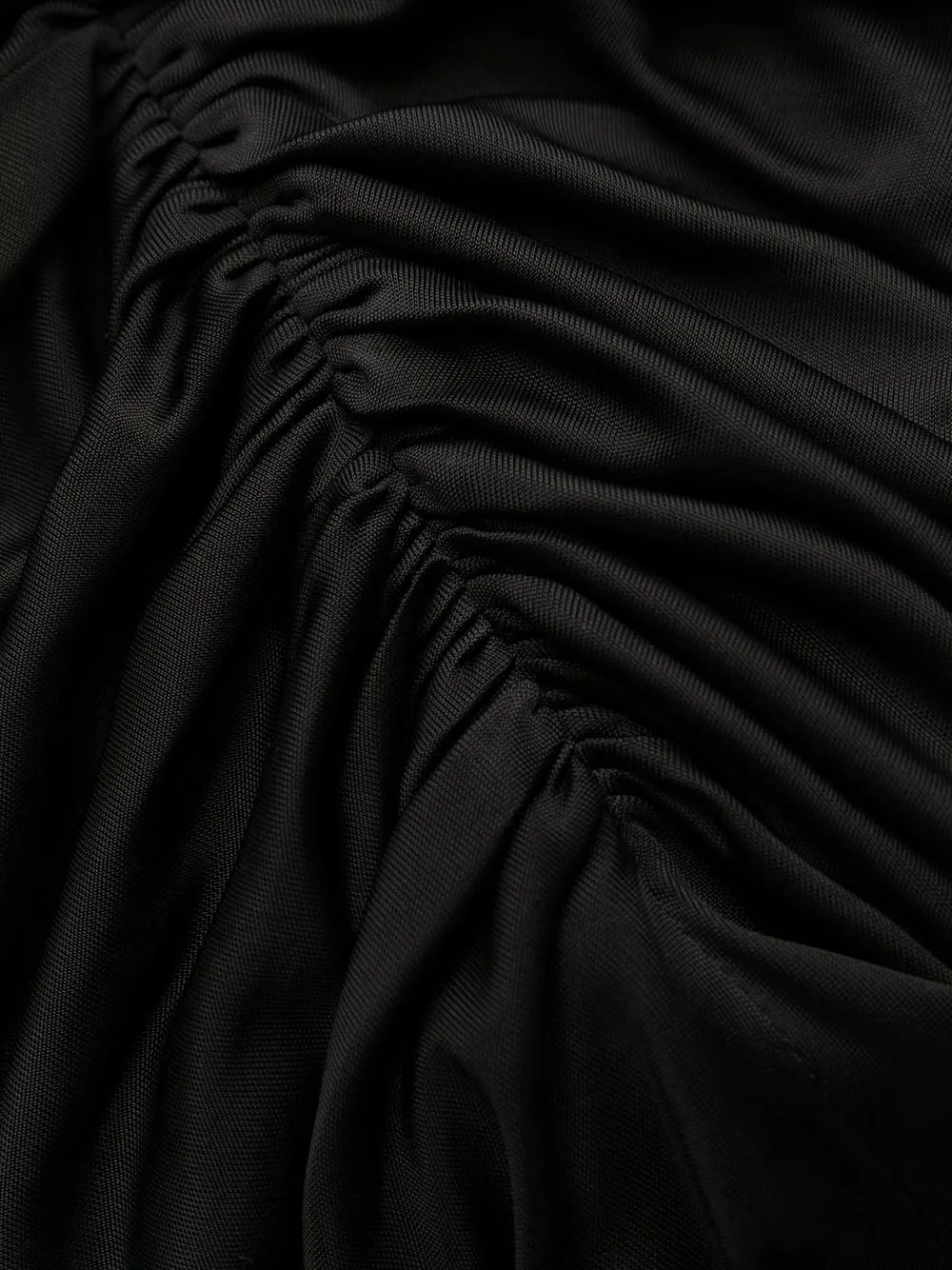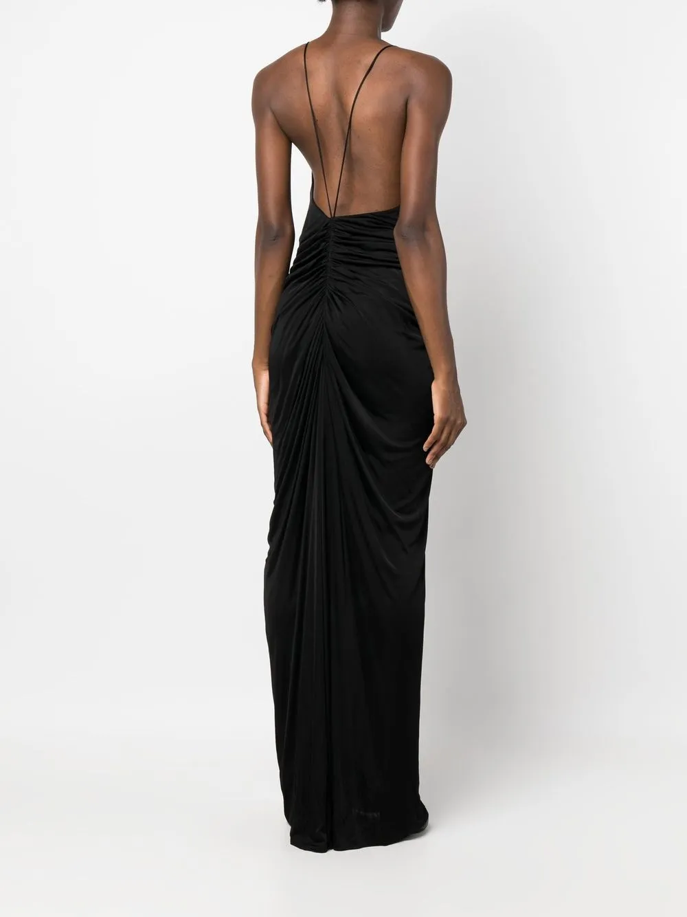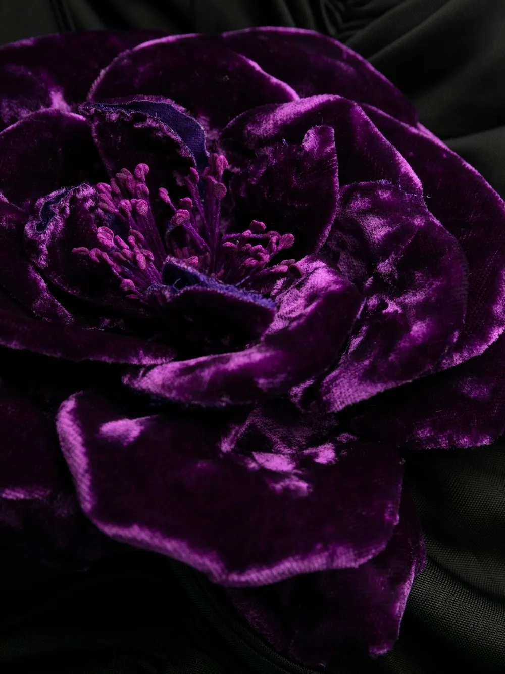 floral-appliqué ruched maxi dress from SAINT LAURENT featuring black, purple, silk, floral appliqué, ruched detailing, plunging V-neck, backless, spaghetti straps, sleeveless, straight hem and floor-length.