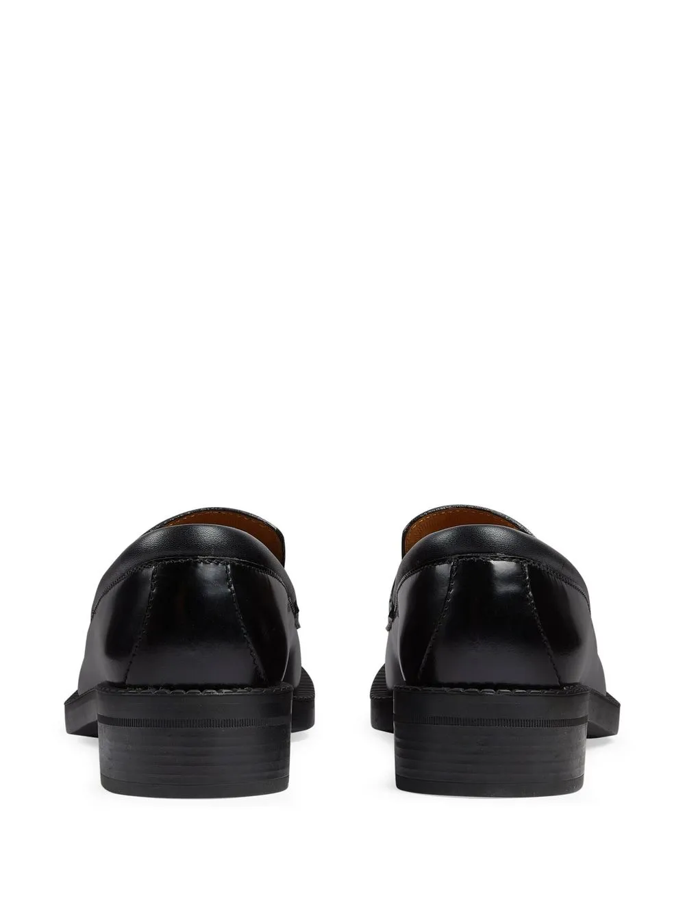GG leather loafers from Gucci featuring black, leather, branded leather insole, logo plaque, square toe, slip-on style, rubber sole and low heel.