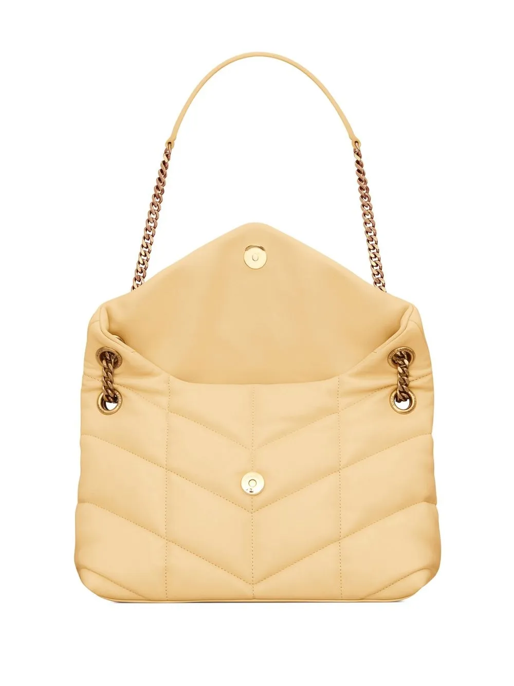 logo-letter puffer shoulder bag from SAINT LAURENT featuring citron pale yellow, lambskin, padded design, gold-tone logo lettering, foldover top with press-stud fastening, chain-link shoulder strap and main compartment.