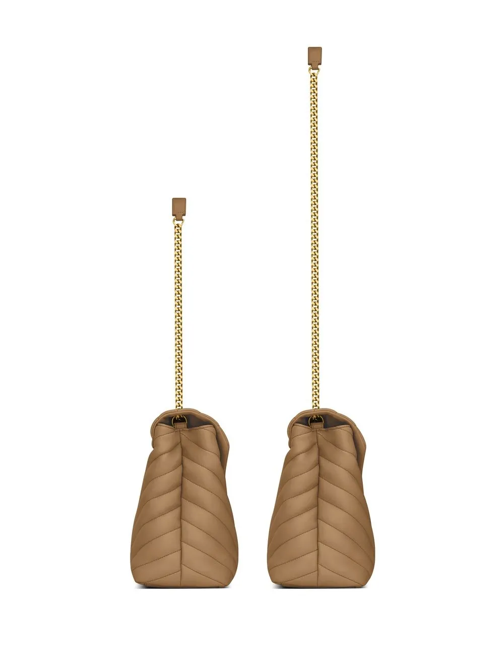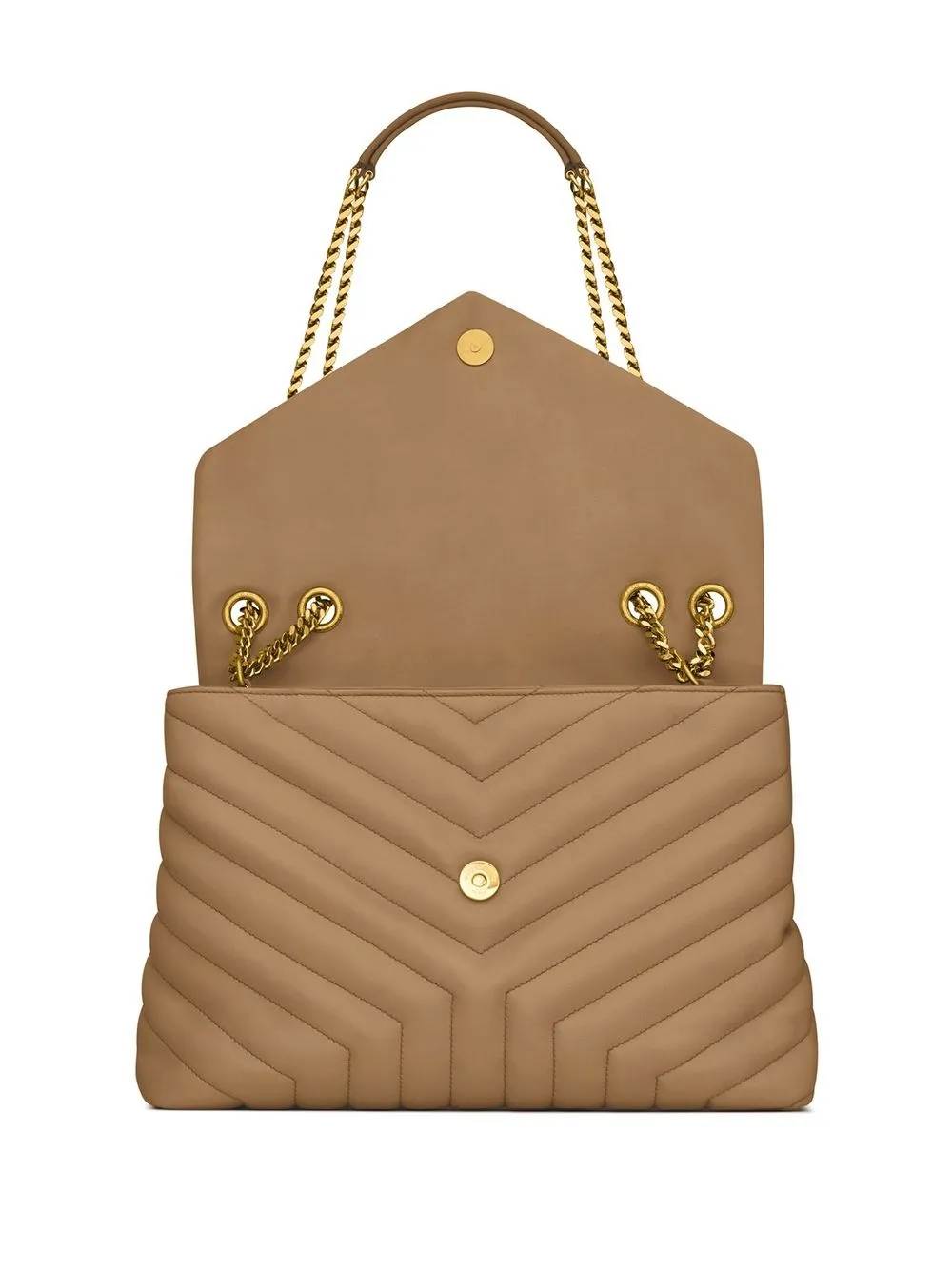 Loulou matelassé shoulder bag from SAINT LAURENT featuring brown, calf leather, matelassé detail, gold-tone logo lettering, foldover top with magnetic fastening, chain-link shoulder strap and main compartment.