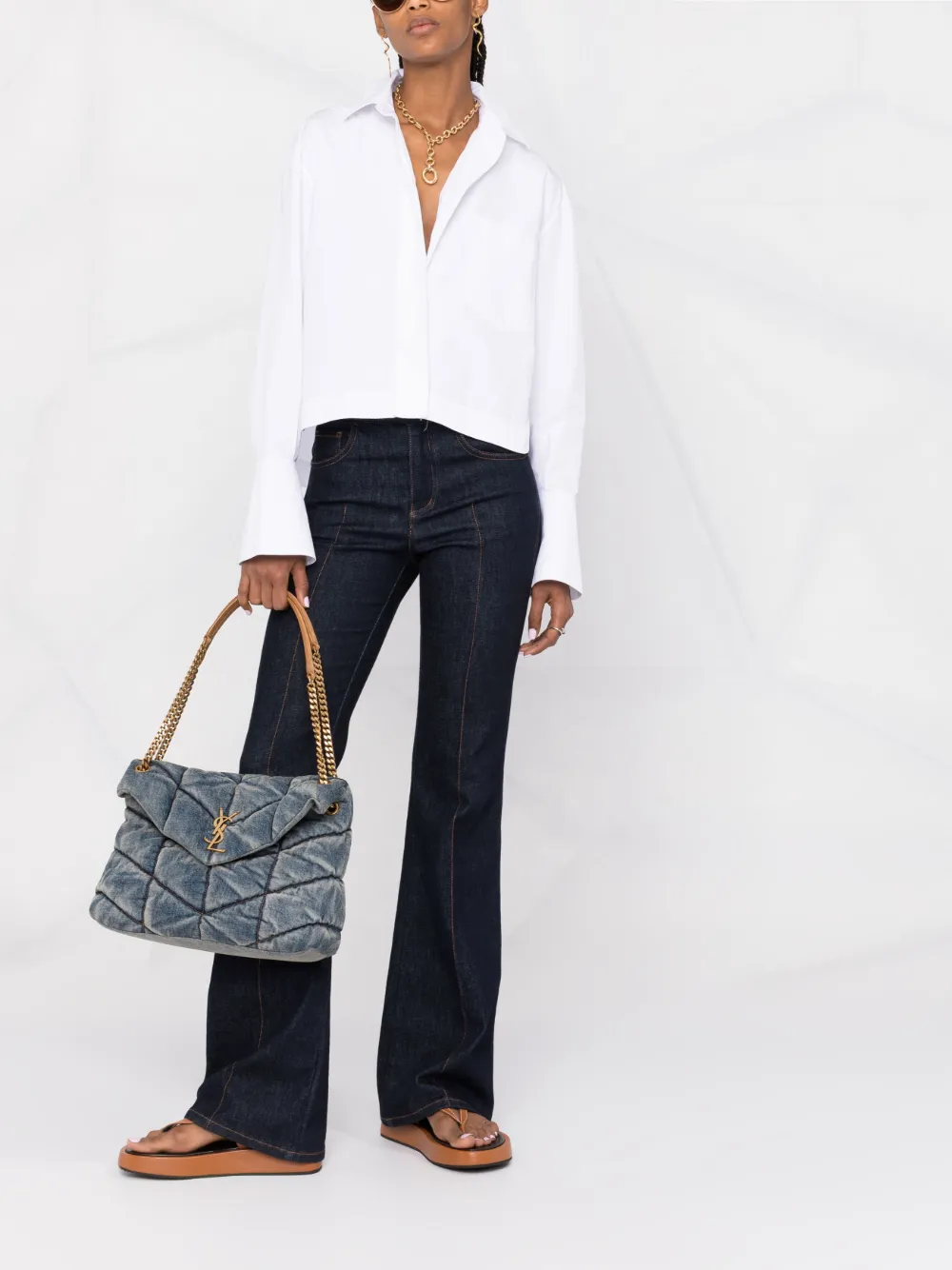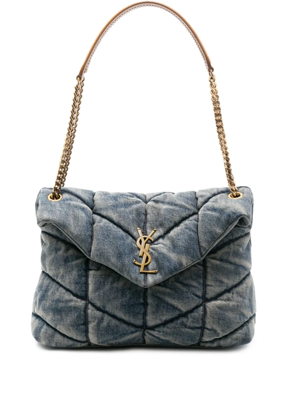 Saint Laurent’s Loulou Puffer shoulder bag is defined by the chevron-quilted denim construction, which accentuates the softened silhouette. Italian crafted, it has the iconic YSL logo plaque at the magnetic envelope flap that opens to a lined interior and a stamped logo patch.