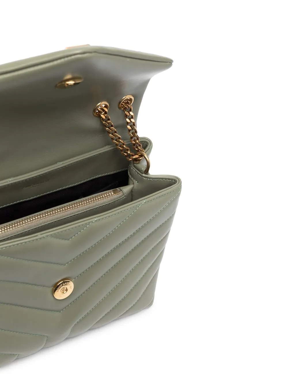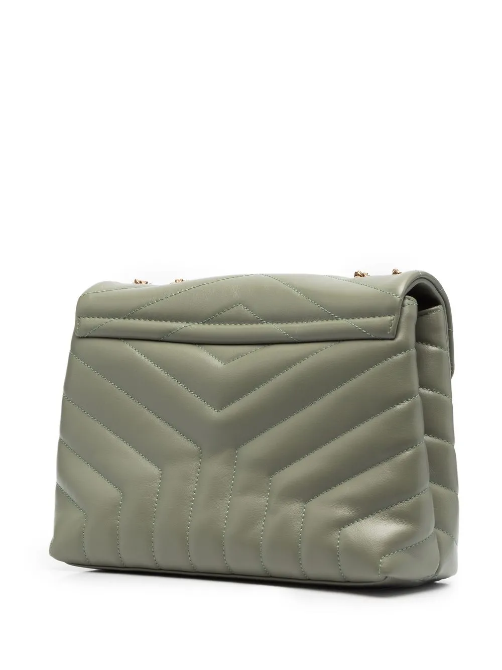 Loulou small monogram shoulder bag from SAINT LAURENT featuring sage green, calf leather, quilted panels, chain-link shoulder strap and foldover top.