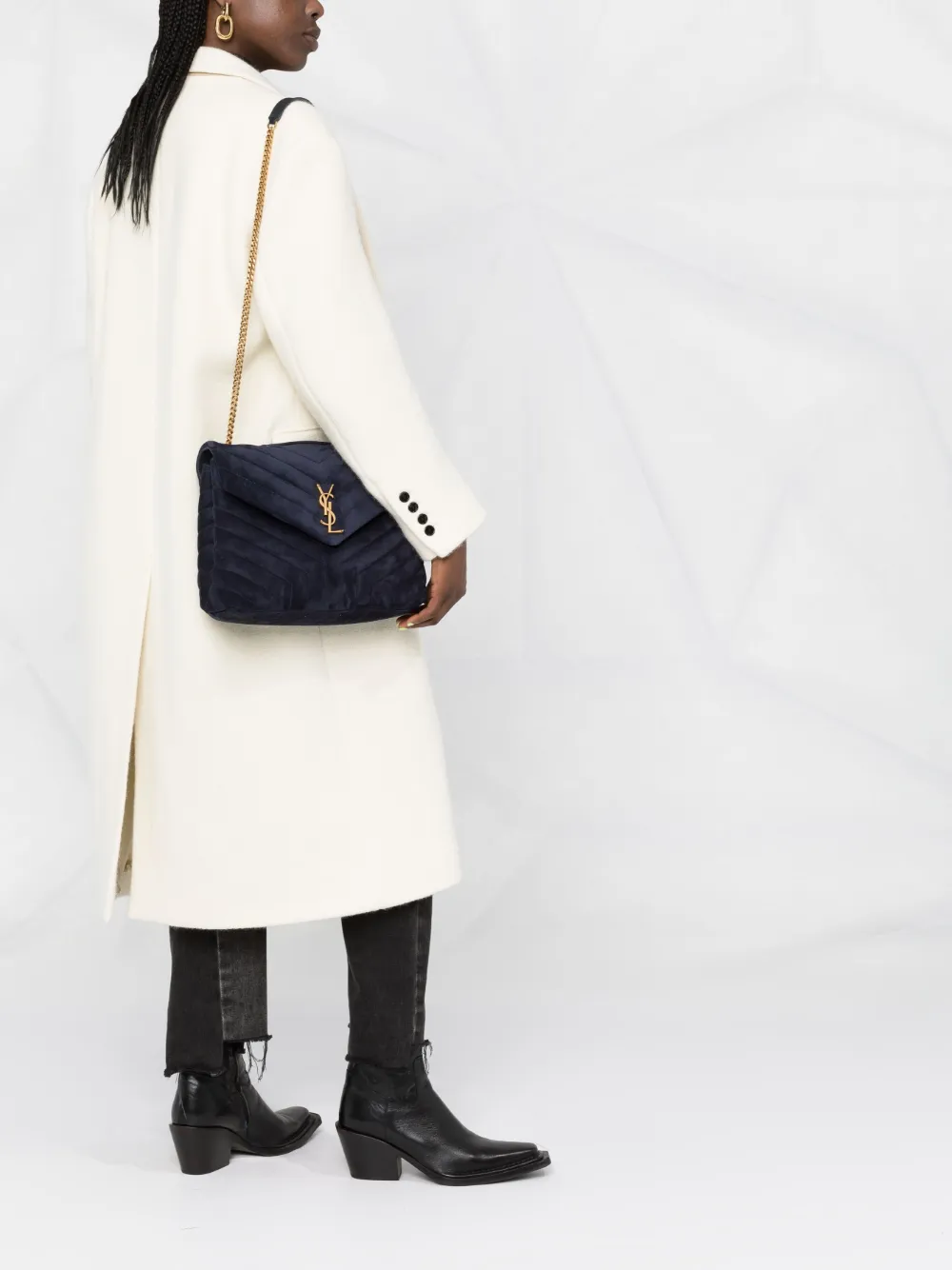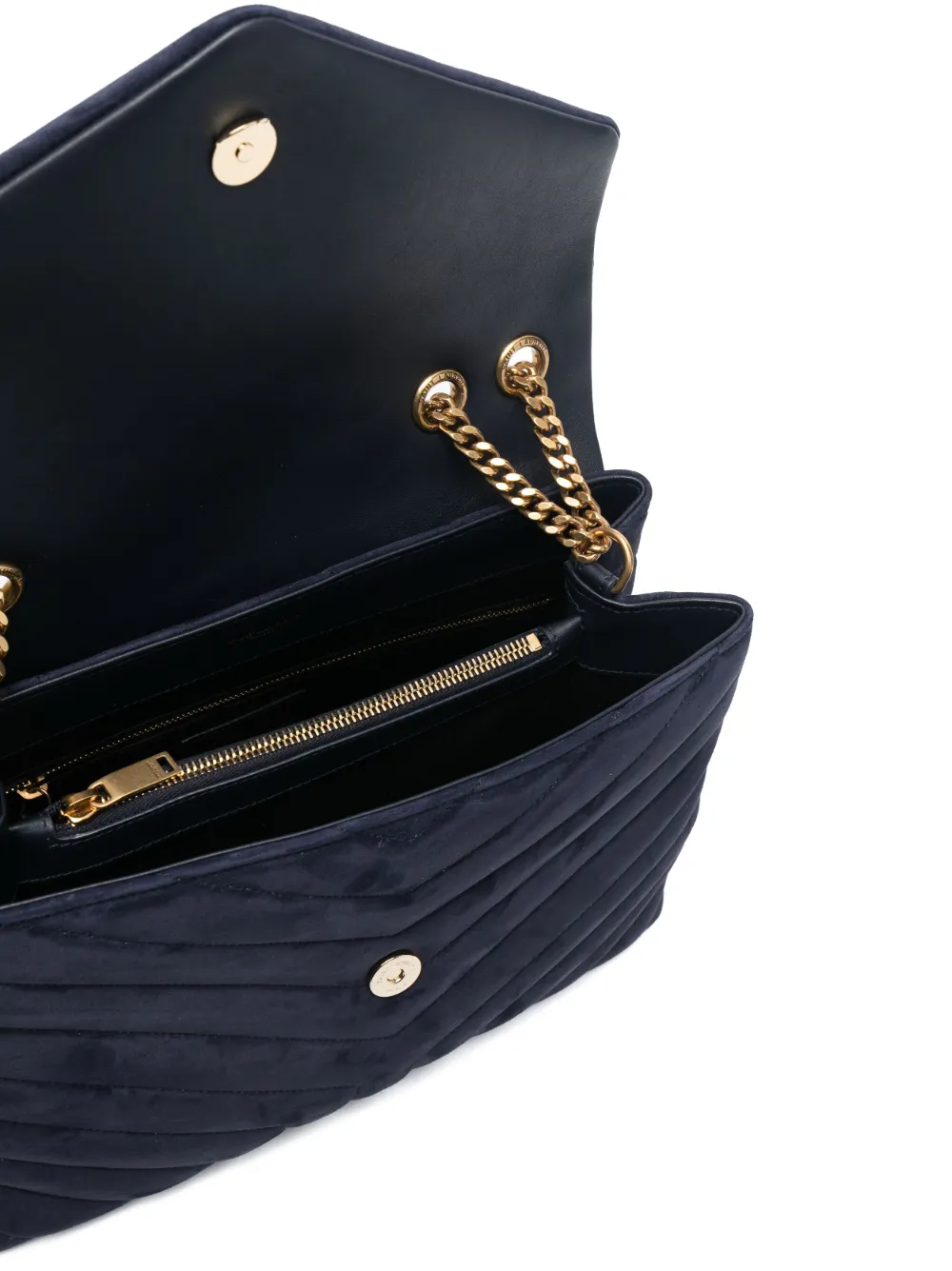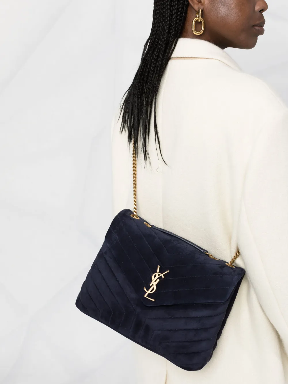 Saint Laurent's LouLou shoulder bag showcases the Parisian label's fine leather craftsmanship through the use of chevron quilting. Signature gold-tone monogram hardware punctuates the front, a hallmark of the label.