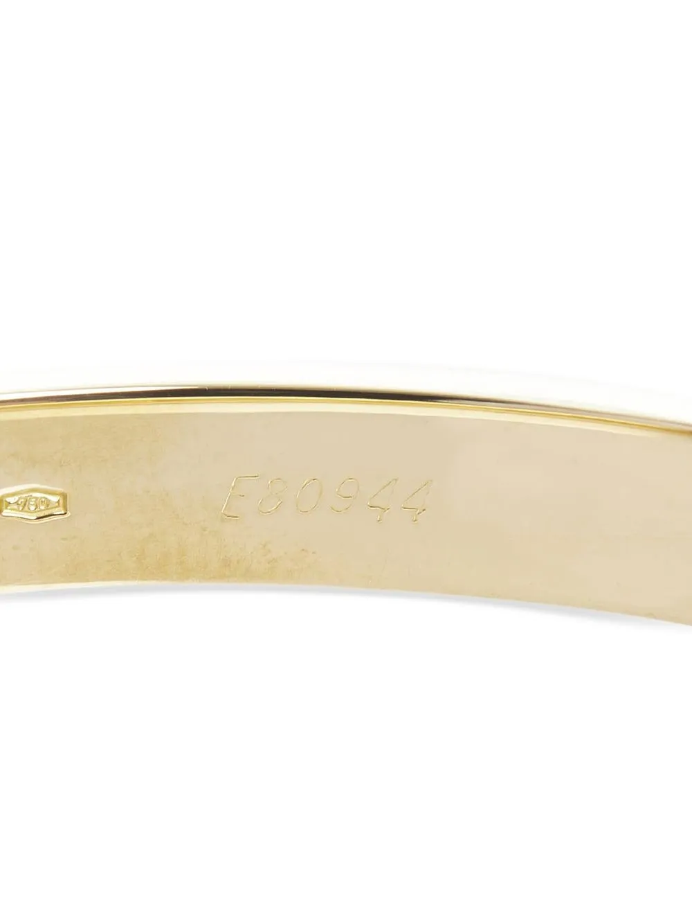 pre-owned 18kt yellow gold Love bracelet from Cartier Pre-Owned featuring 18kt yellow gold, screw-clasp fastening, polished finish and engraved logo. Condition: GOOD. This previously owned and used item is in good condition with minimal signs of use. This may include fading of material or plating and scratches.. POSITIVELY CONSCIOUS: Purchasing this item continues its narrative and reduces the environmental impact of using new resources. You can be confident that you’re making a better choice for the Planet..