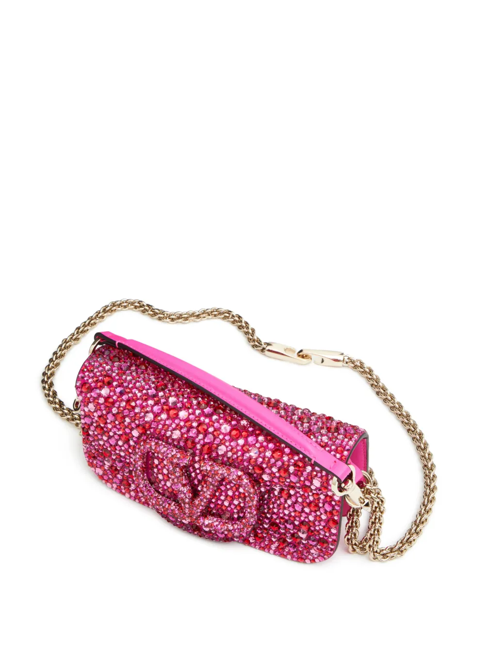 Inspired by 90s styles, this Locò bag is presented in a small version and embellished with all-over rhinestones. It can be worn as a crossbody/shoulder bag or carried as a handbag thanks to the detachable sliding chain strap and detachable handle, showcasing the versatility of its design.