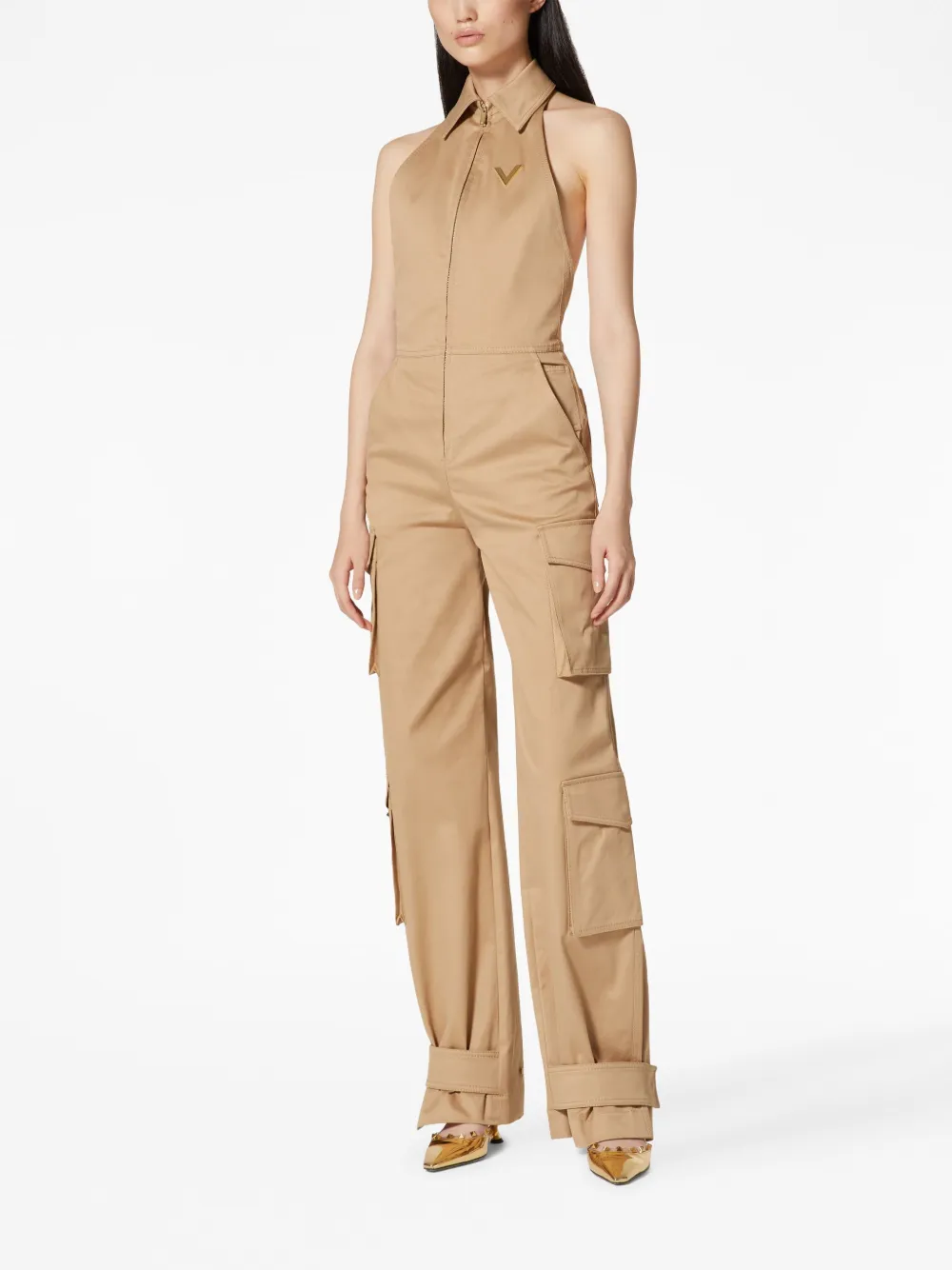 Valentino Garavani takes a utilitarian-inspired approach in this beige one-piece. Cut from stretch-cotton, its cargo jumpsuit silhouette channels a functional mood, to which the sleeveless, open-back construction acts as an elegant contrast.